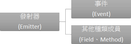發設計就是一個物件,物件底下有成員、方法等等...而發射器特殊的地方在於它有一個特殊的成員叫事件(Events):
