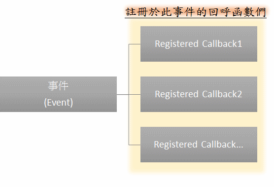 打個比方來說,發射器如同董事長,事件就像部門主管,註冊的函數就像部門職員,董事長請部門主觀執行任務,主管通知每個部門 職員後,部門職員就各自去完成自己的任務。